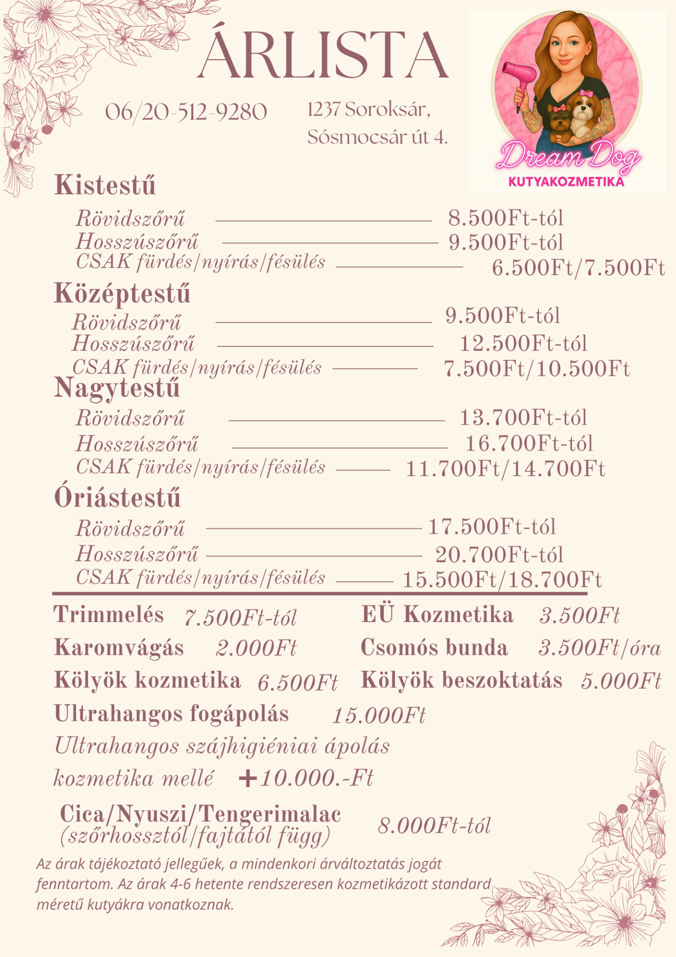 Az árak tartalmazzák a fürdetést, szárítást és a fésülést.